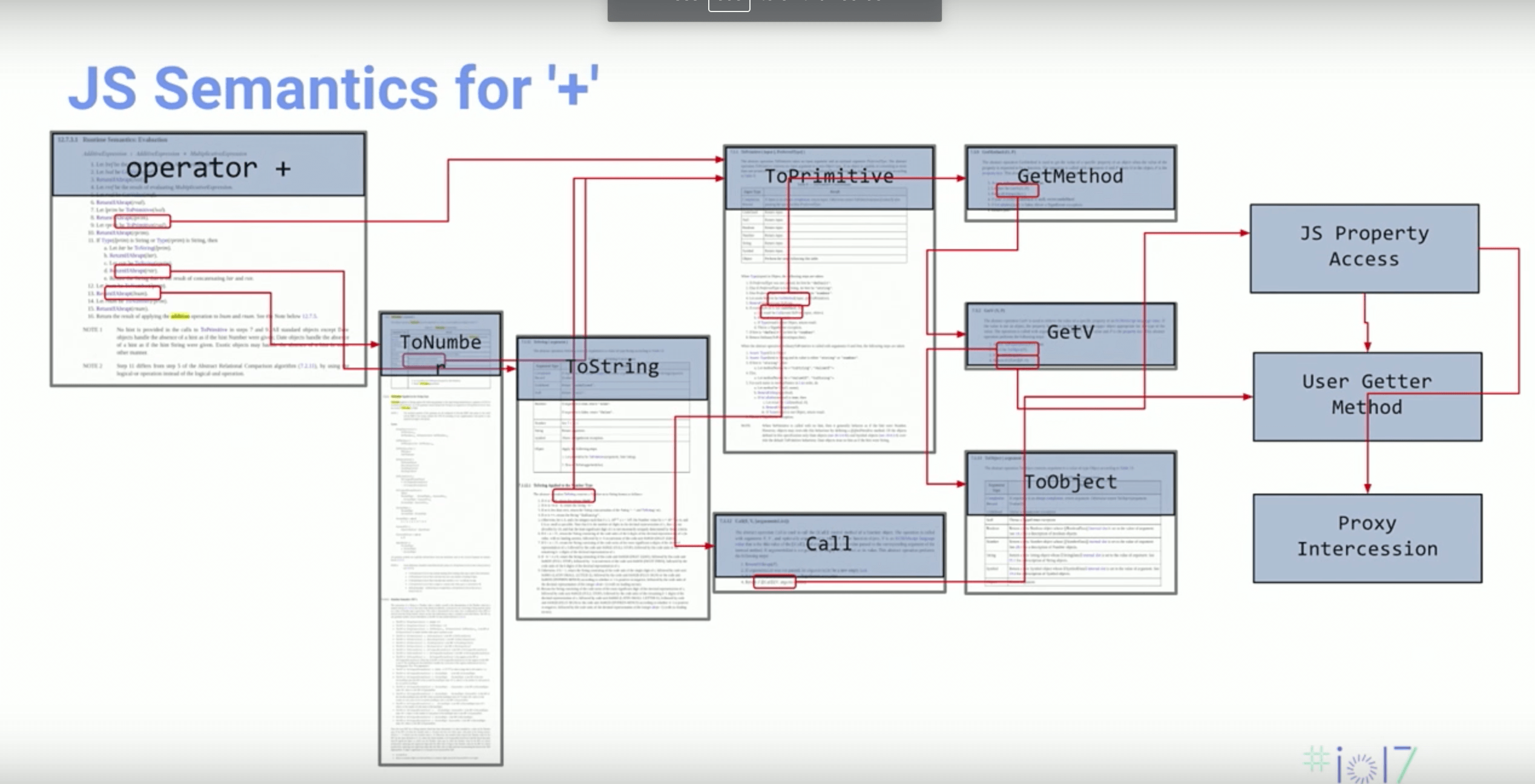 对于上述给出的这段简短的 JS 代码,引擎在遇到加号 “+” 运算符时,并不是直接将两个变量的值相加。由于我们在程序运行前无法判断加号运算符两侧传入变量值的实际类型,因此也就无法判断是应该将两个变量的值当作数值(整型、浮点型)相加还是应该当作字符串进行拼接,甚至是当作对象来进行处理。JS 引擎会根据 ECMAScript 的标准来对加号运算符进行一系列判断才能够得到最后的运算结果。对应加号运算符的 ECMAScript 标准如下图所示(图片来自 Google IO 2017):