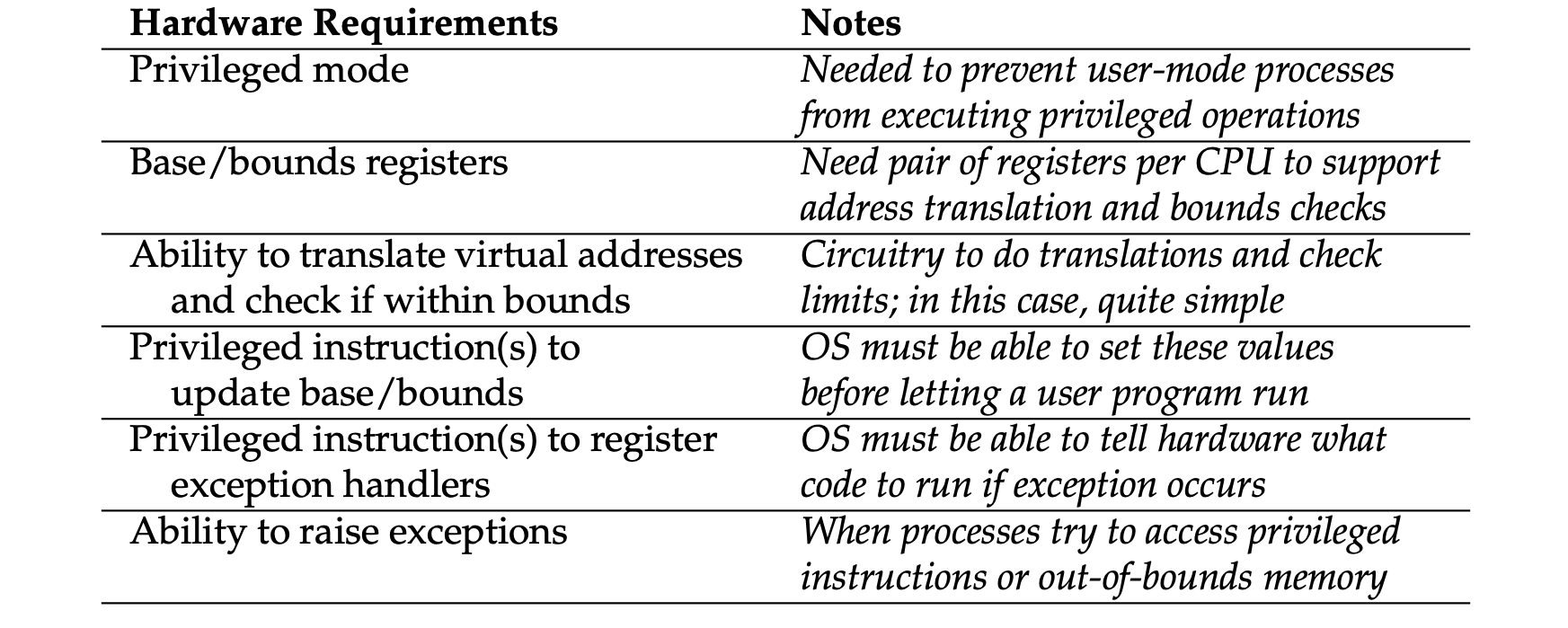 - Dynamic relocation: hardware requirements: